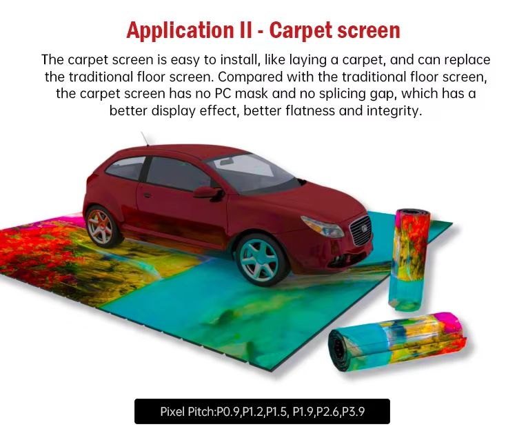 A flexible LED floor screen, sometimes referred to as a rollable LED magic carpet, is a bendable LED display designed to adapt to non-flat surfaces. It uses soft circuit boards and silicone-based materials, making it light, thin, and easy to roll. This allows for creative installations on curved floors, stages, ramps, or even wrapped around architectural structures. Its flexibility makes it an ideal choice for mobile exhibitions, pop-up events, and futuristic installations where design freedom is a priority.