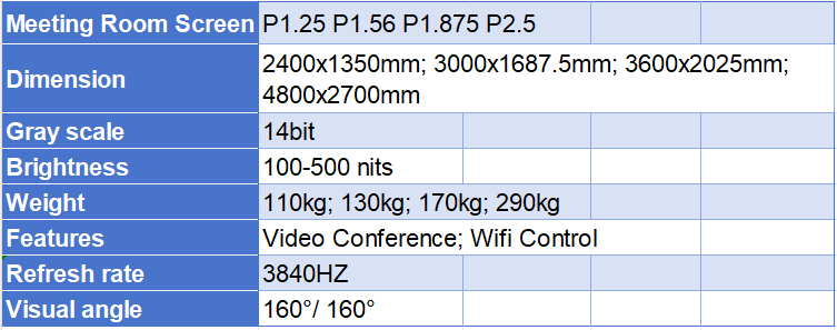 2400x1350mm; 3000×1687.5mm; 3600x2025mm; 4800x2700mm