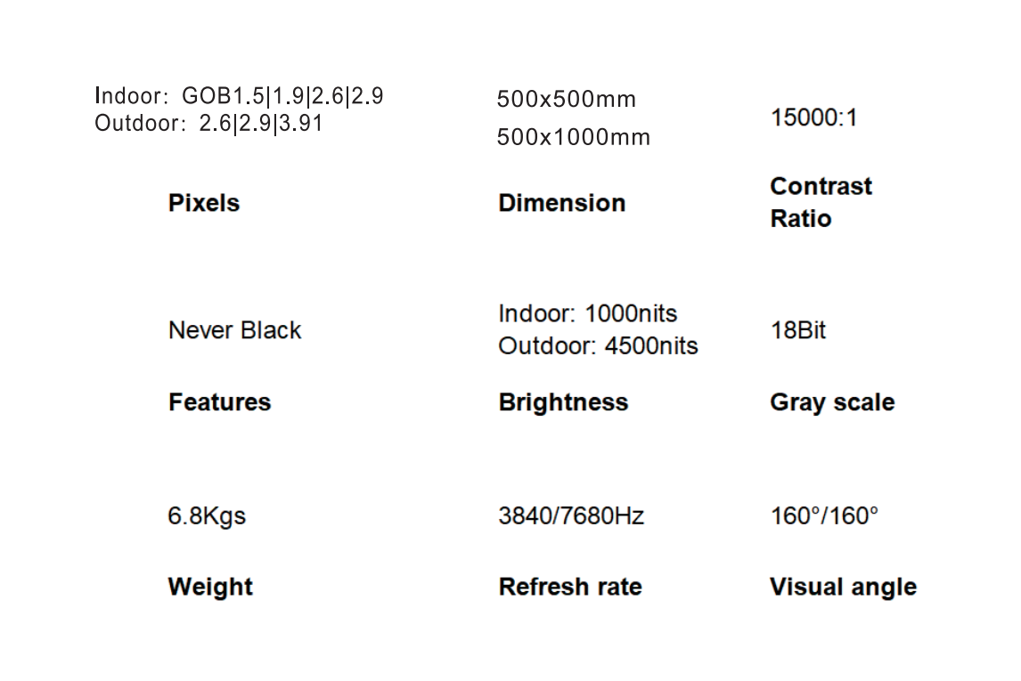 | Indoor: GOB1.5|1.9|2.6|2.9 | 500x500mm | 15000:1 |