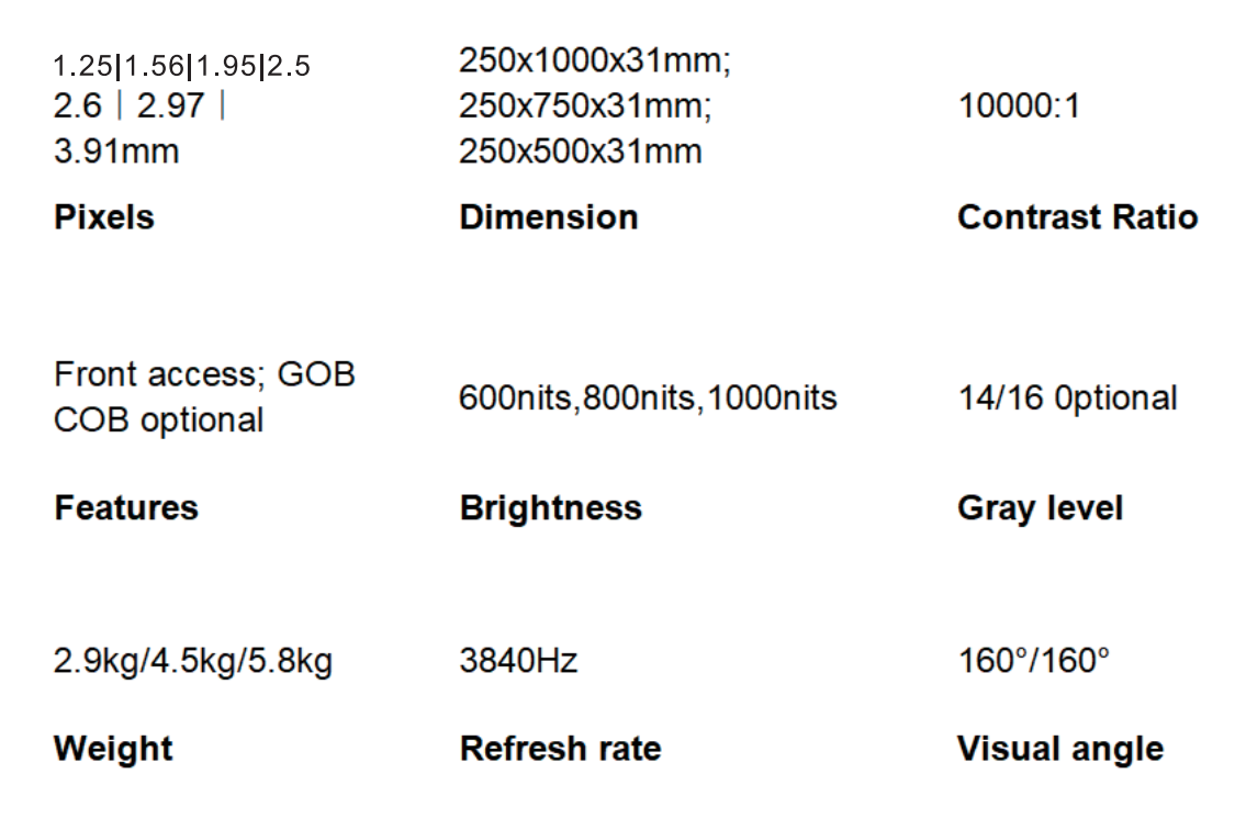 | LED Type | SMDD1212(GOB) | SMD1515 | SMD1515 | SMD1515 | SMD1515 | SMD2020 |