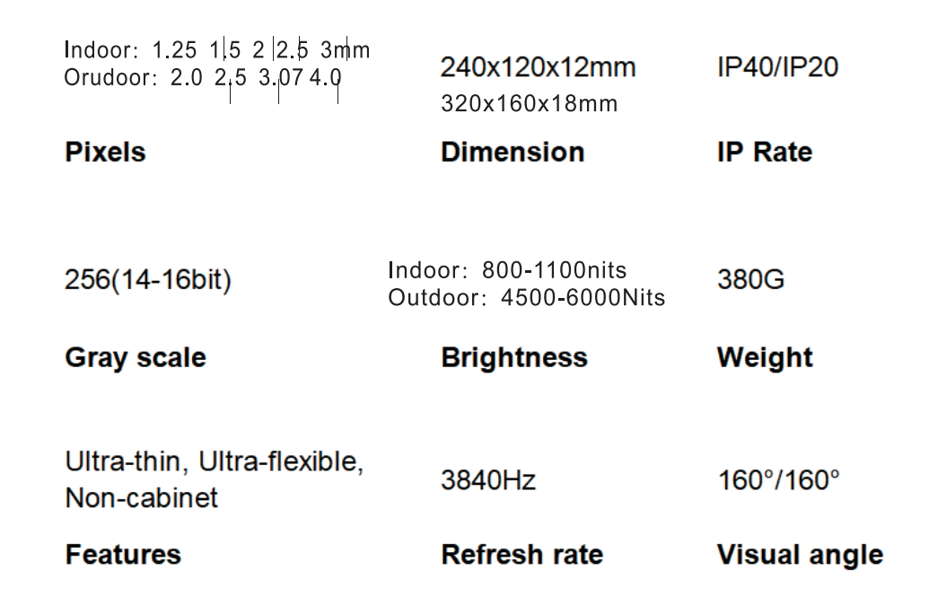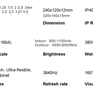 | Pixel Pitch (mm) | 1.5 | 2.0 | 2.5 | 3.0 |