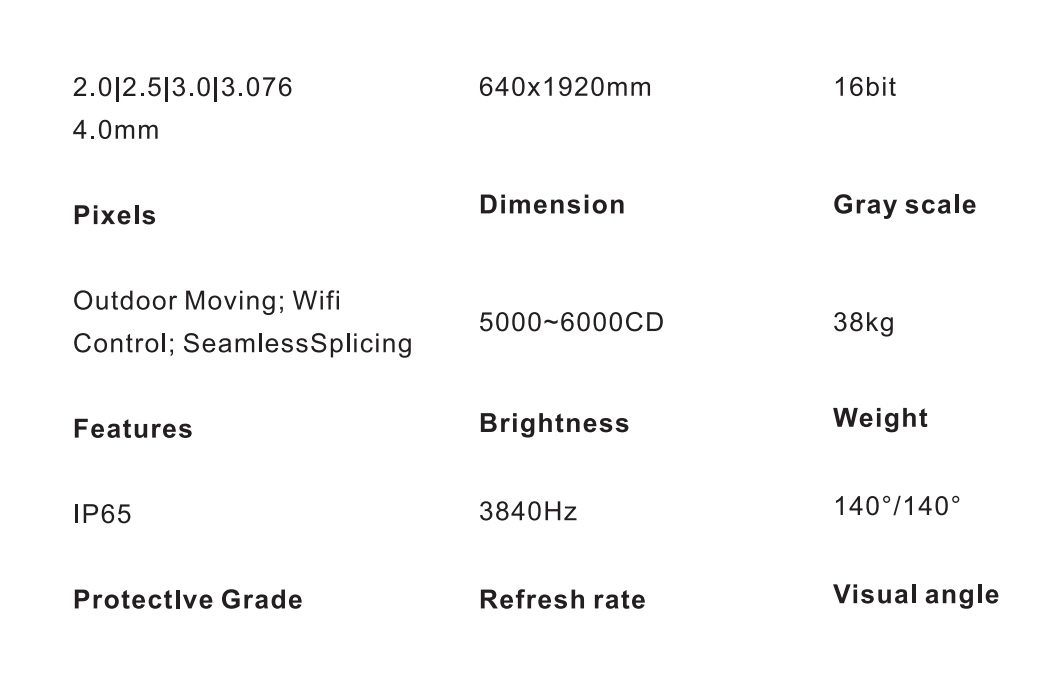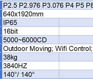 Pixel Pitch:P2.5/P2.976/P3.076P4/P5/P8/P10